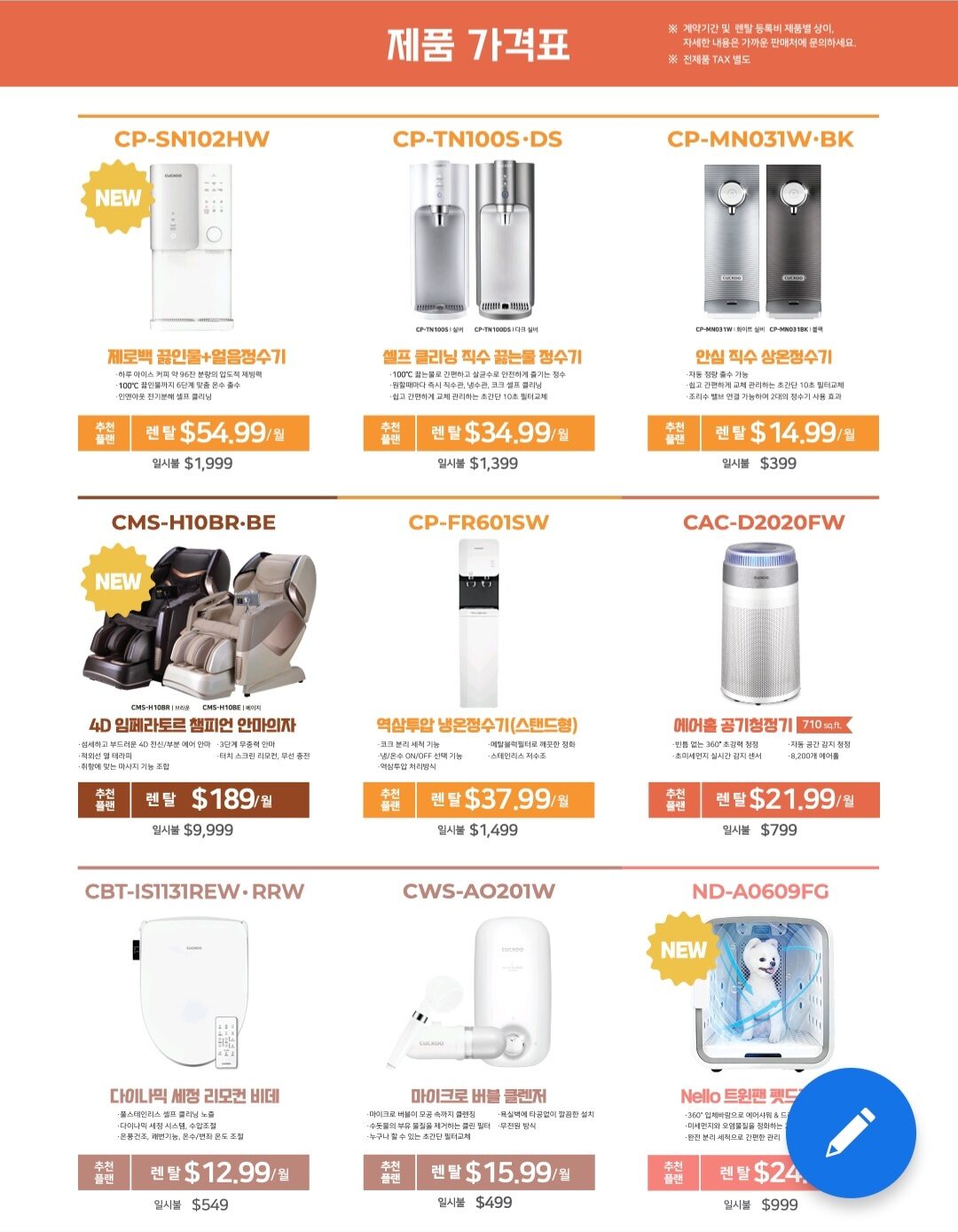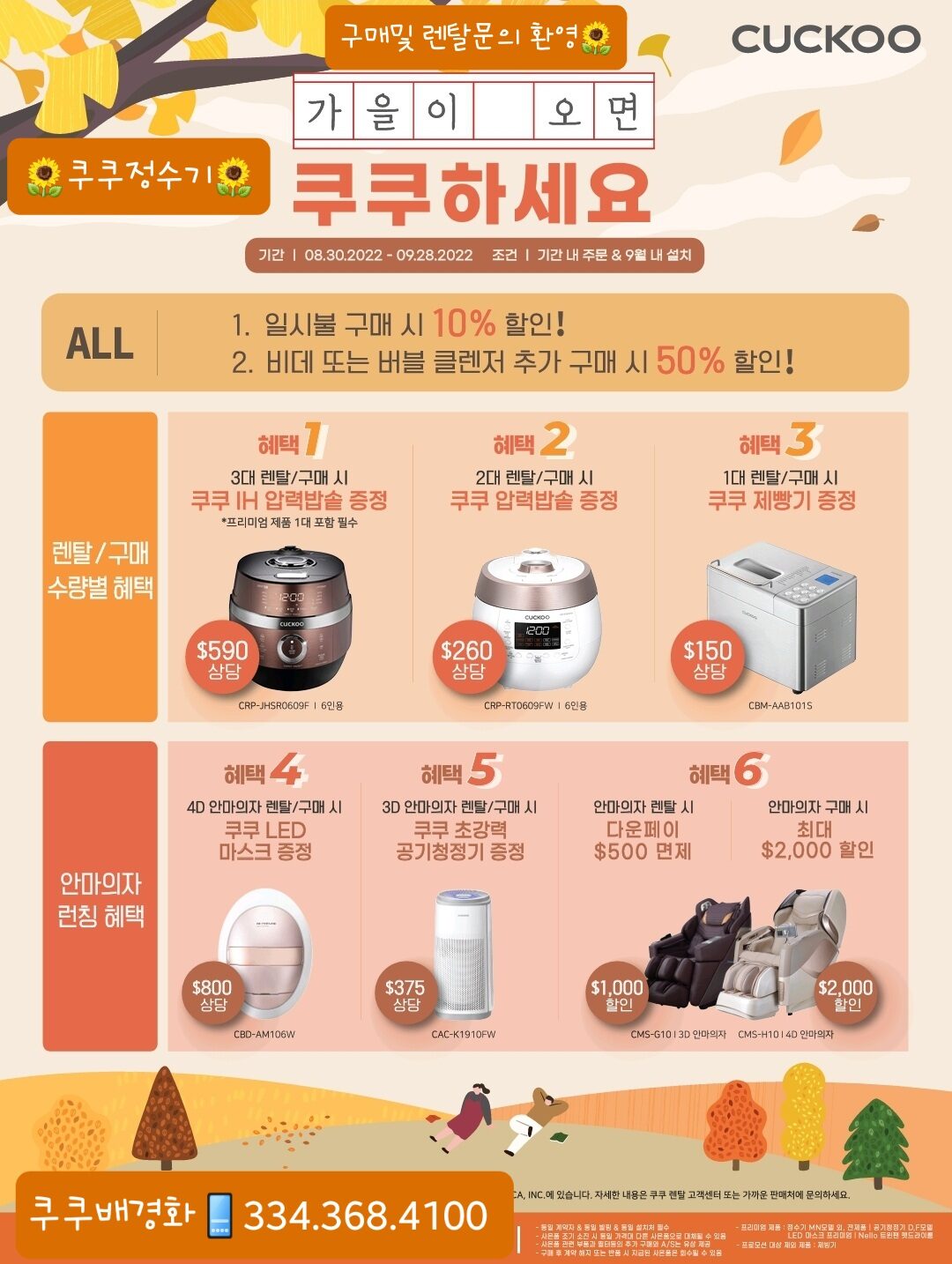 안녕하세요.. 쿠쿠배경화에요..지난 8월프로모션에 뜨겁게 관심가져주시고주문주셔서 너무 감사드려요..가을을맞아 새로운 마음으로, 9월프로모션시작됐으니,,많은 관심 부탁드립니다. [9월프로모션 혜택]♦️하나 렌탈및 구매시-150불상당 쿠쿠제빵기!!♦️둘 렌탈및 구매시-260불상당 쿠쿠압력밥솥!!♦️셋 렌탈및 구매시-590불상당 IH압력밥솥!!♦️구매시10%할인,추가시 50%할인(비데.공청기.버블클린저)♦️3D안마의자렌탈/구매-400불상당 초강력공기청정기증정♦️4D안마의자렌탈/구매-800불상당LED마스크증정!♦️안마의자구매시-최대 2000불할인!!이번 9월프로모션이 너~~무 좋네요..이런 멋지고 좋은 기회놓치지마시고,필요한제품있으면 편하게 문의주세요.성심을다해 안내해드릴께요..감사합니다. 쿠쿠배경화☎️334.368.4100.