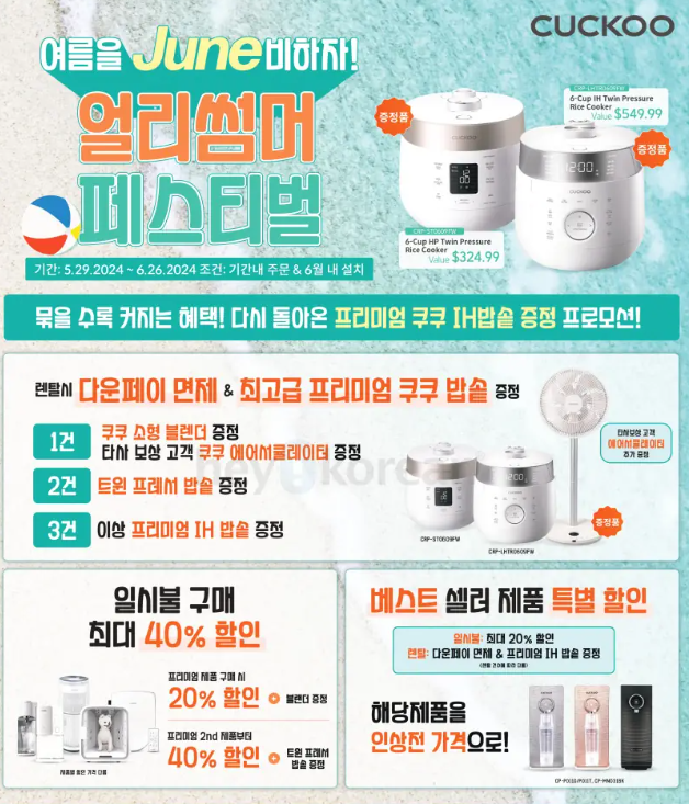 쿠쿠렌탈 6월 Big 프로모! 정수기, 청정기 월 $14.99부터!